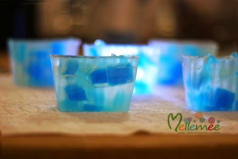 The first picture was actually not a successful story. I couldn't get the transparent that I wanted; the snowflakes were too light that they floated; I was too rush to pour the blue liquid soap, the high temperature destroyed some of my snowflakes. Therefore I had to cut the whole batch to look for a fine piece. Where did the rest of the blue go? To my next batch below. :)